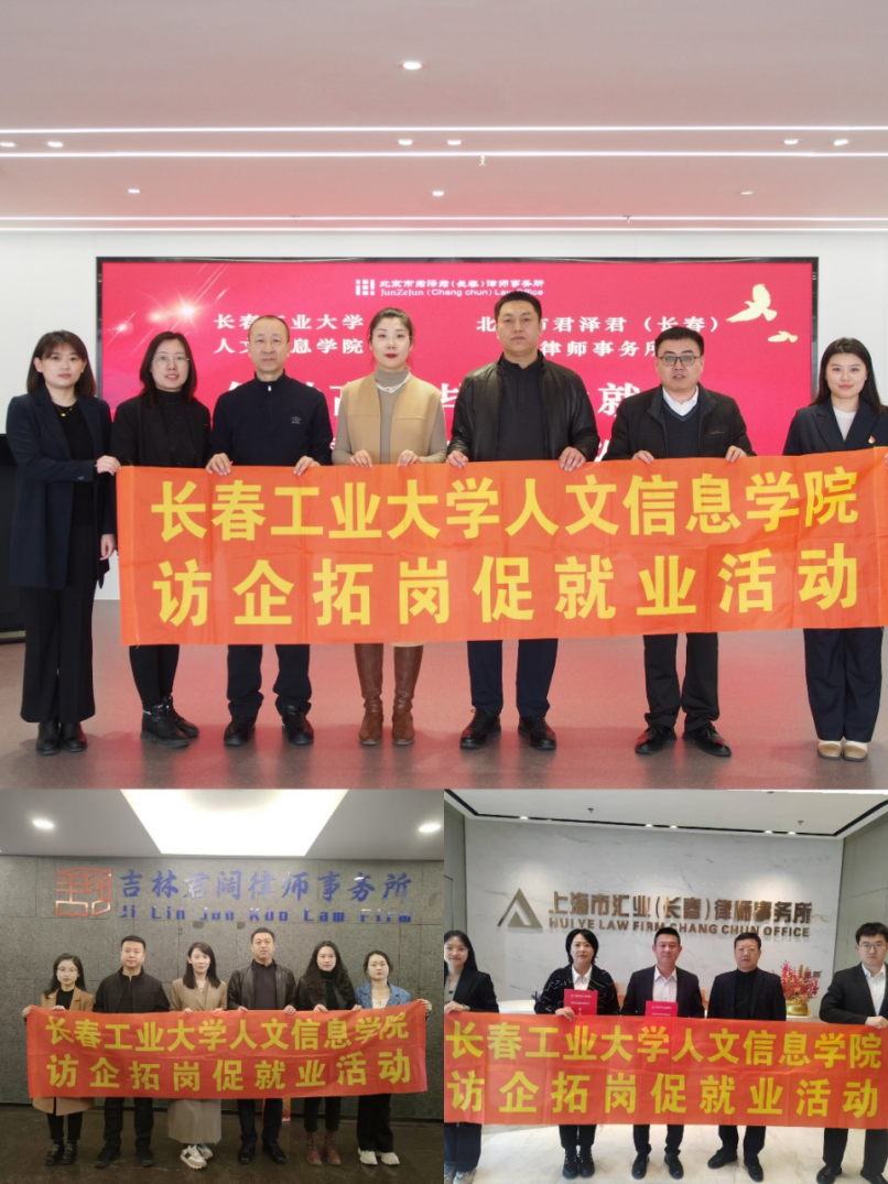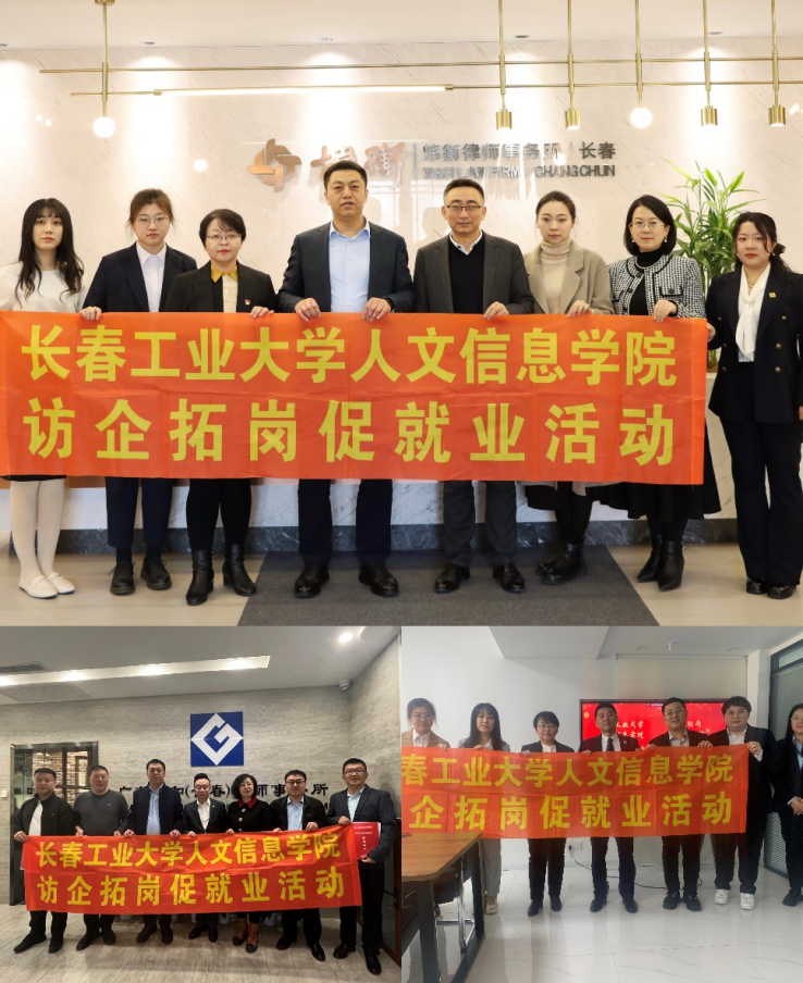 法学院先后走访北京市炜衡(长春)律师事务所、北京市君泽君(长春)律师事务所、广东广和(长春)律师事务所、上海市汇业(长春)律师事务所、吉林君阔律师事务所、吉林熙尚律师事务所等8家企业,签订《促进毕业生就业战略合作协议》8份,开拓相关就业岗位20余个,并与4名校友进行座谈交流。