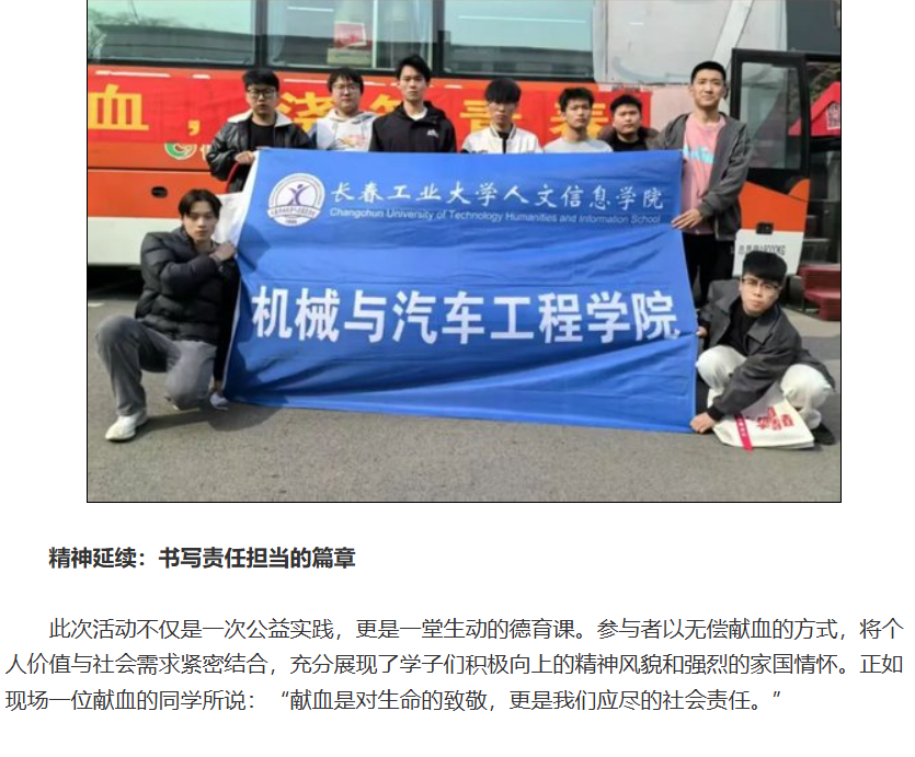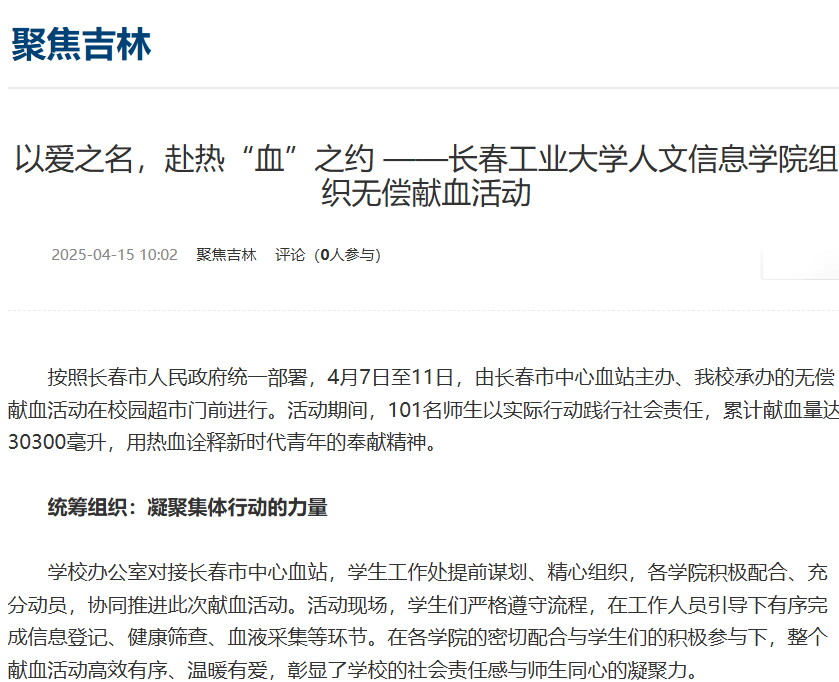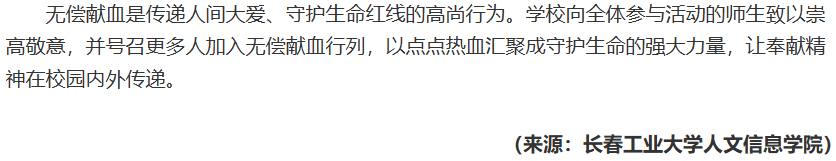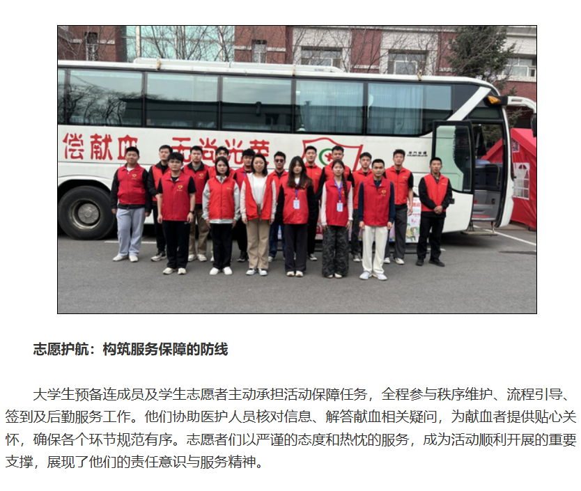 按照长春市人民政府统一部署,4月7日至11日,由长春市中心血站主办、英国365公司官网承办的无偿献血活动在校园超市门前进行。活动期间,101名师生以实际行动践行社会责任,累计献血量达30300毫升,用热血诠释新时代青年的奉献精神。